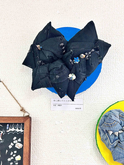 教科書だけでなく、実際に学校で使用されたテストやプリントを利用し、また描画素材として黒板塗料や赤ペンなどを使った「紙類」作品の他、「布類」の造形作品は古着の子供服やオムツ、制服などに綿を詰めて作られている。